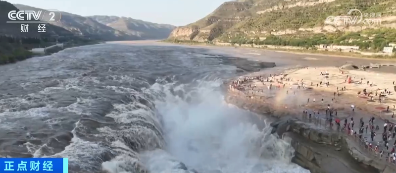 据了解,黄河壶口段目前正处于秋汛期,最大水流量约为1300立方米/秒,是日常水流量的3倍,主瀑与副瀑连成一片,呈现出一条线状,场面壮观。