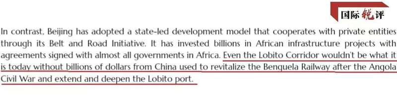 黎文涛认为,美国试图把“洛比托走廊”包装成美欧为非洲基建作出的贡献,完全不符合事实。因为它的核心骨架中国早已搭好,中国才是名副其实的最大贡献者。“洛比托走廊”官网上也有这样一段话:“如果没有中国投入数十亿美元重建本格拉铁路、扩建洛比托港口,‘洛比托走廊’就没有当今的模样。”
