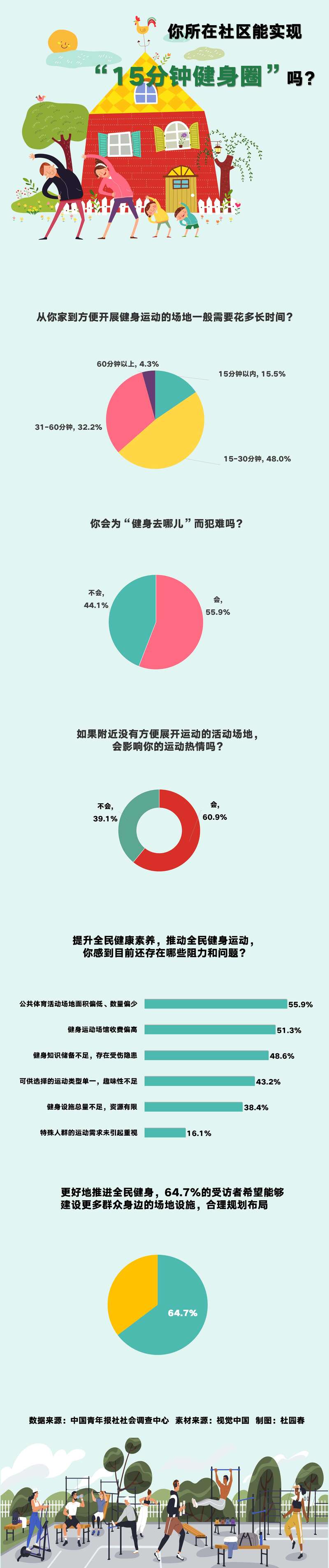 从家出发只需不到一刻钟的时间就能步行到达运动锻炼场地,这是很多人对日常体育活动地点距离的期待。你家附近有方便开展体育活动的场地吗?建设“15分钟健身圈”,你有哪些期待?日前,中国青年报社社会调查中心联合问卷网(wenjuan.com),对1000名受访者进行的调查显示,仅15.5%的受访者表示从家到方便健身运动的场地用时能在15分钟以内。64.7%的受访者呼吁建设更多群众身边的运动场地设施。