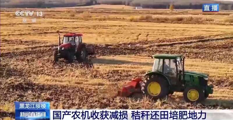 总台记者 于文波:田里有多台收割机在作业,割稻、脱粒、秸秆粉碎一气呵成,装满稻粒的收割机正在卸粮,收割后的田里还有机械正在整地。