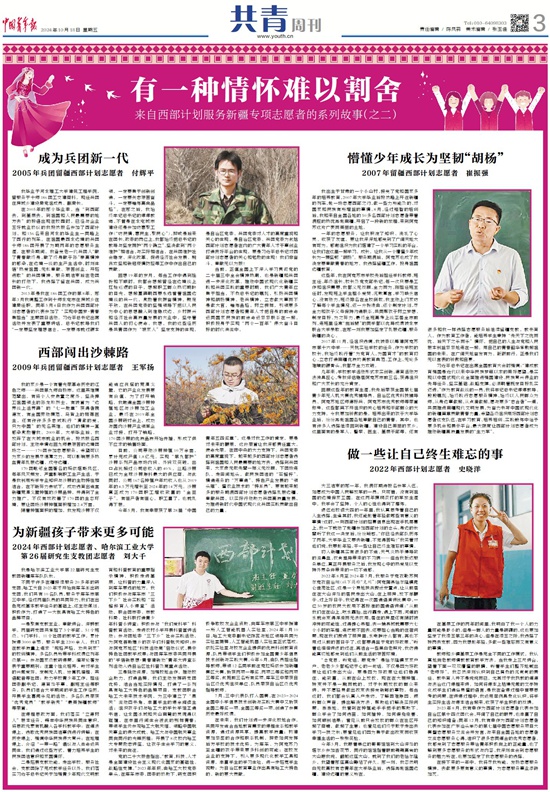 当前,正值全国上下深入学习贯彻党的二十届三中全会精神热潮,也是新疆和兵团进一步深化改革、推动中国式现代化新疆实践和兵团实践的重要时期,我们广大青年应勇于担当,不负总书记的嘱托,弘扬兵团精神和胡杨精神、老兵精神,立志做大事而不是做大官,锤炼品格,树立榜样,引领更多西部计划志愿者和青年人才把自身的前途命运同国家民族的前途命运紧紧联系在一起,积极投身于实现“两个一百年”伟大奋斗目标的时代洪流中。