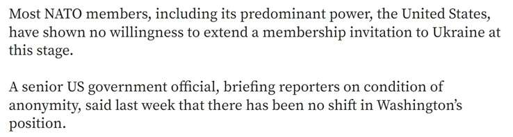 目前,包括美国在内的大多数北约成员国都没有表现出向乌克兰发出加入北约邀请的意愿。一位匿名的美国政府高级官员此前对媒体表示,目前华盛顿的立场没有改变。
