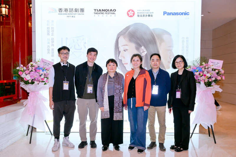 香港驻京办副主任阮慧贤(左三)与文化和旅游部港澳台办交流处处长汪勤(右三)、香港话剧团行政总监梁子麒(右二)、香港话剧团助理艺术总监兼《暧昧》导演方俊杰(左二)、《暧昧》编剧郑国伟(左一)合影。香港驻京办供图
