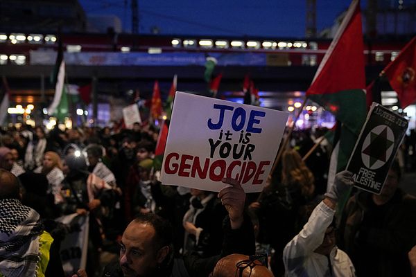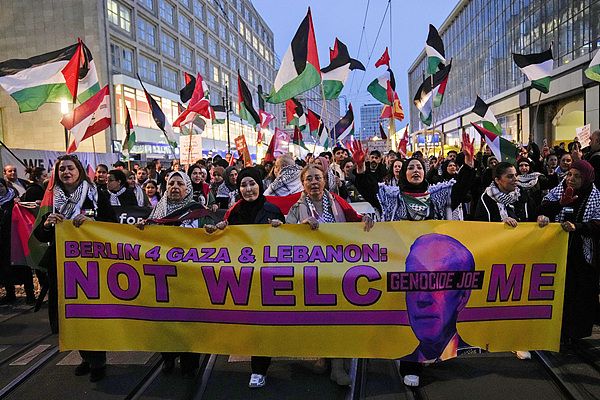 当地时间2024年10月18日,德国柏林,在亲巴勒斯坦集会上,示威者举着横幅抗议美国总统拜登访问德国。