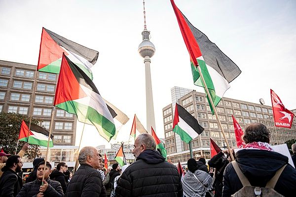 当地时间2024年10月18日,德国柏林,在亚历山大广场,人们参加了一场反对美国总统访问的亲巴勒斯坦示威活动,他们的口号是“拜登不受欢迎”。