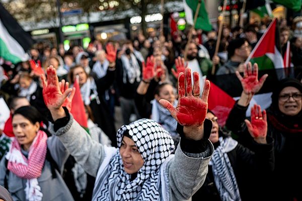 当地时间2024年10月18日,德国柏林,在亚历山大广场,手持红漆的人们参加亲巴勒斯坦示威活动,他们的口号是“拜登不受欢迎”。