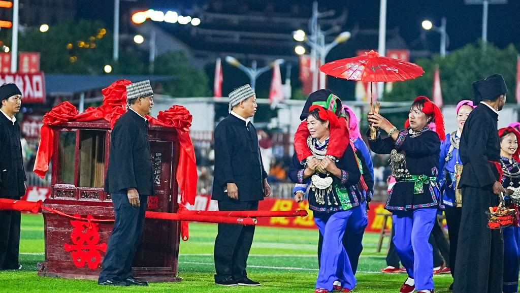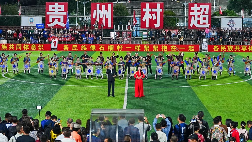 2024年10月19日,贵州黔东南州,锦屏大同乡村民在湾区高校校友·贵州榕江村超足球联赛开幕式上表演。