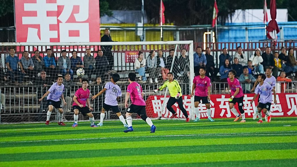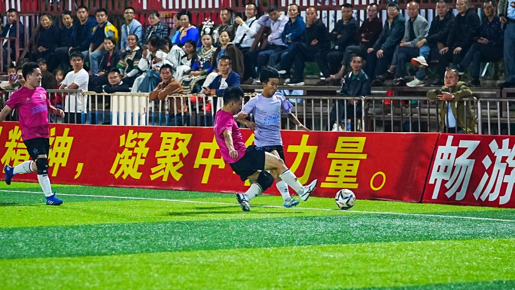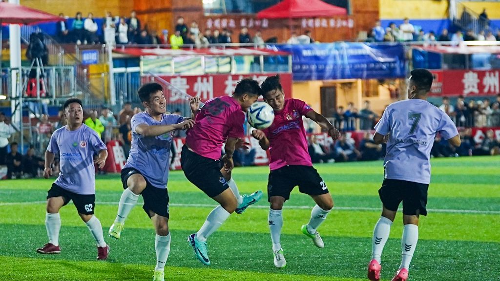 2024年10月19日,贵州黔东南州,江财车江二康博电子足球队球员与西大寿洞诗和远方足球队球员在比赛中。