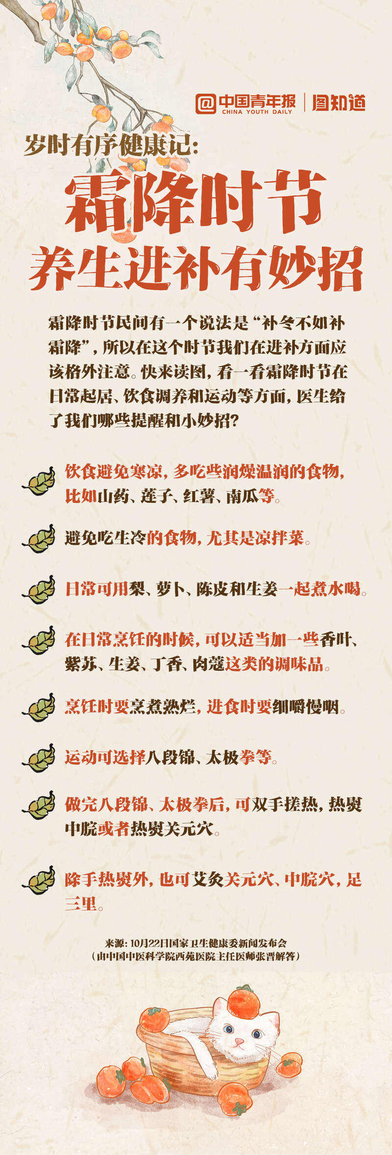 霜降时节民间有一个说法是“补冬不如补霜降”,所以在这个时节我们在进补方面应该格外注意。快来读图,看一看霜降时节在日常起居、饮食调养和运动等方面,医生给了我们哪些提醒和小妙招?