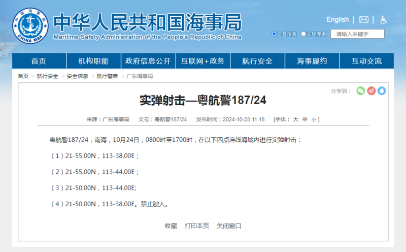 据中国海事局网站消息,广东海事局发布航行警告,10月24日8时至17时,南海部分海域进行实弹射击,禁止驶入。