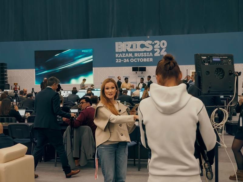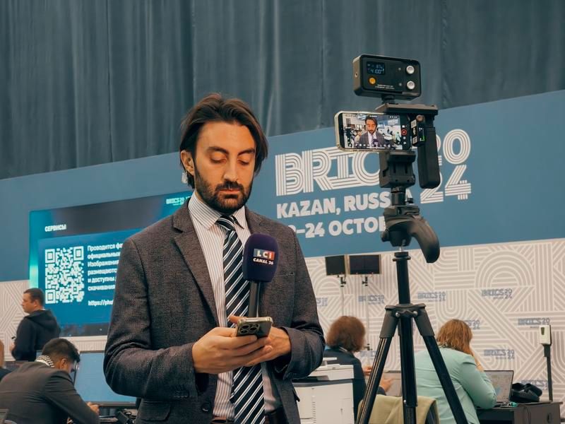 10月22日,俄罗斯喀山,法国新闻频道(LCI)的记者在金砖国家领导人第十六次会晤新闻中心为直播连线做准备。中青报·中青网记者 赵祺/摄