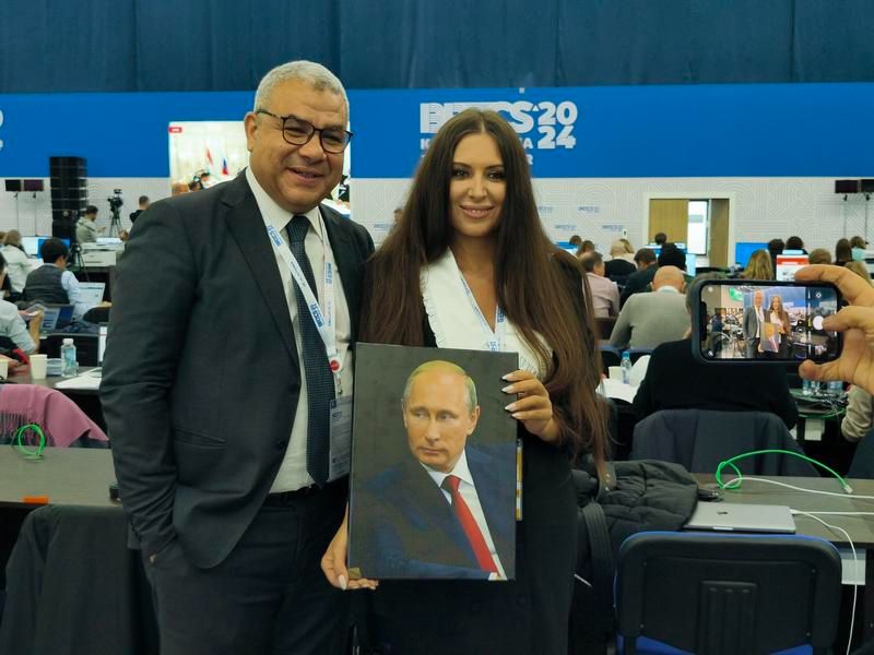 10月22日,俄罗斯喀山,金砖国家领导人第十六次会晤新闻中心开始运行,两名媒体工作人员手捧俄罗斯总统普京画像在接受采访。中青报·中青网记者 赵祺/摄