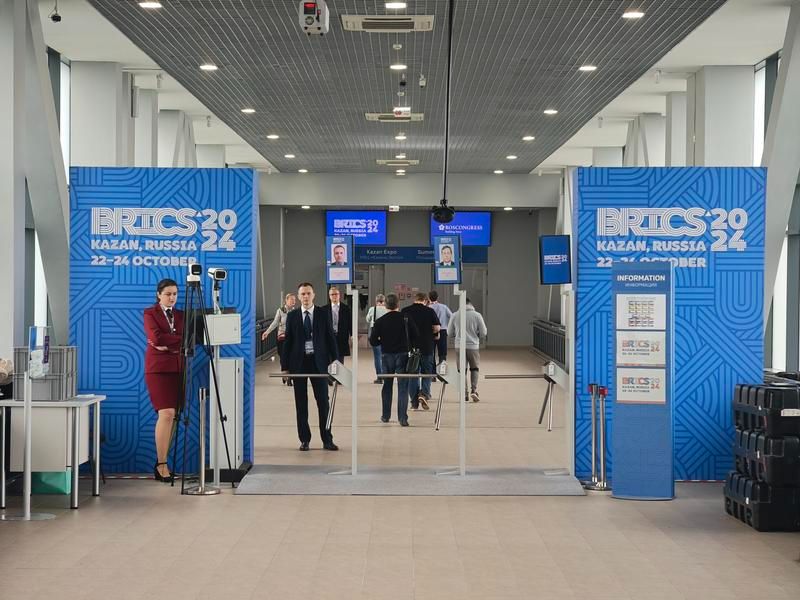 10月22日,俄罗斯喀山,金砖国家领导人第十六次会晤新闻中心正式开始运行。图为新闻中心安检入口。中青报·中青网记者 赵祺/摄