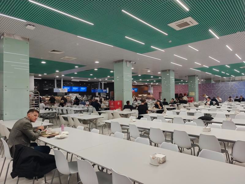 10月22日,俄罗斯喀山,金砖国家领导人第十六次会晤新闻中心开始运行,多国媒体工作人员在新闻中心餐厅用餐。中青报·中青网记者 赵祺/摄