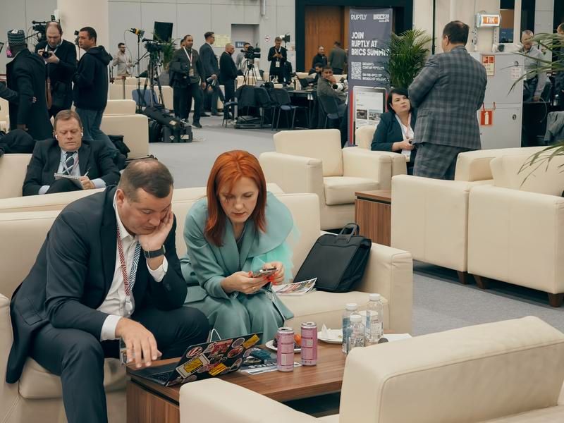 10月22日,俄罗斯喀山,金砖国家领导人第十六次会晤新闻中心开始运行,图为两名媒体工作人员在新闻中心休息区交流。中青报·中青网记者 赵祺/摄