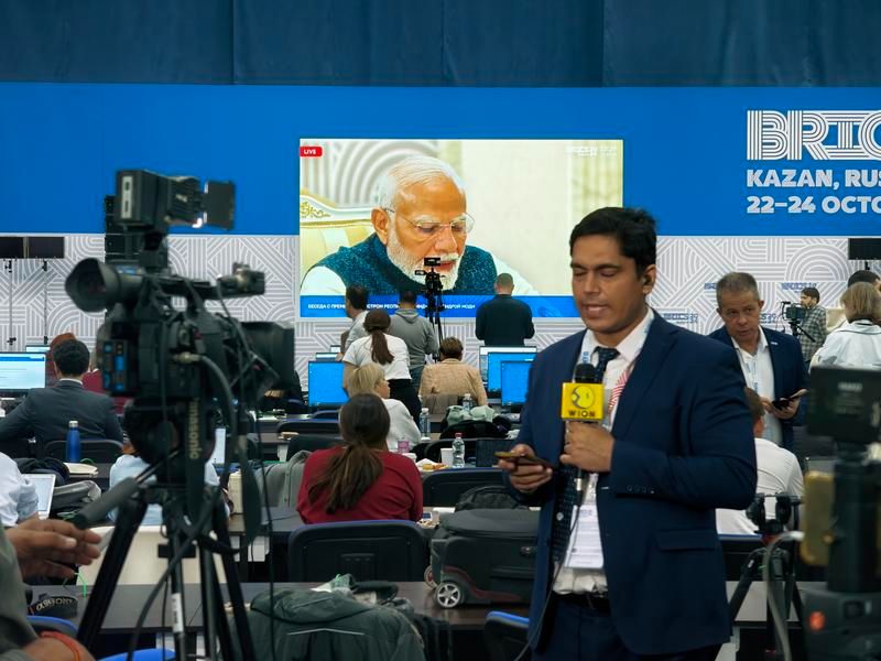 10月22日,俄罗斯喀山,印度WION电视台记者在金砖国家领导人第十六次会晤新闻中心做现场报道,中心大屏幕上播放着印度总理莫迪抵俄参加金砖峰会的画面。中青报·中青网记者 赵祺/摄