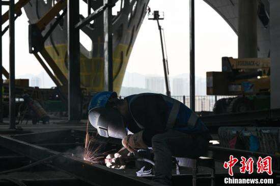10月22日,重庆东站施工现场,中铁建工工人在进行焊接作业。
