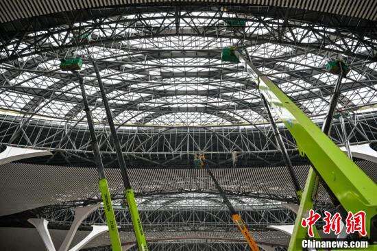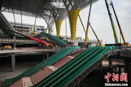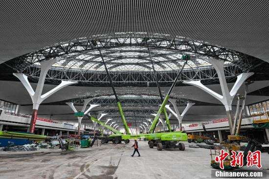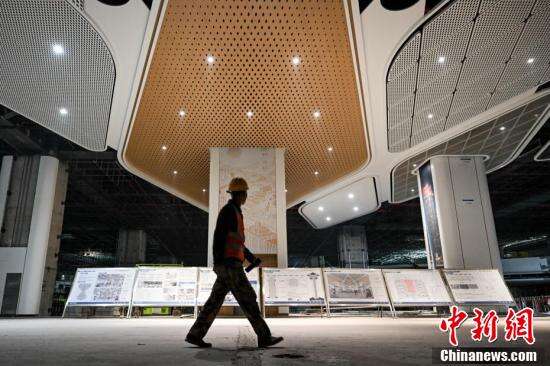 重庆东站位于重庆市南岸区,是交通强国建设的站城一体化试点工程,也是中国西部地区最大高铁枢纽站,由中铁建工集团等单位共同建设。重庆东站总建筑面积达122万平方米,站场规模3场15台29线。截至目前,重庆东站屋面及天窗、玻璃幕墙、树型柱等施工已接近尾声,室内装饰装修和机电设备安装施工正加速推进,预计年底完工,计划于2025年建成投用。项目建成后,将引入渝湘高铁、渝万高铁、渝贵高铁、渝昆高铁等多条线路,对完善重庆“米”字形高铁网,推动成渝地区双城经济圈和西部陆海新通道建设具有重要意义。图为10月22日,重庆东站施工现场,中铁建工工人在进行站厅装修作业。