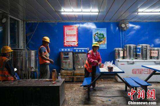 10月22日,重庆东站施工现场,中铁建工工人们在清凉驿站休息。