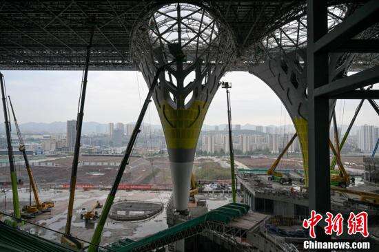 10月22日,重庆东站施工现场,中铁建工工人在进行安装树形柱装饰面板作业。