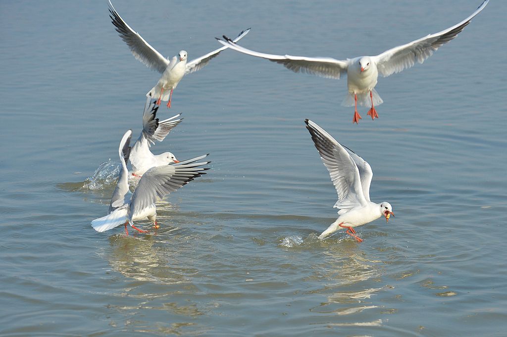 2024年10月29日,山东省青岛市城阳区,流亭街道墨水河入海口湿地,成群红嘴鸥在河岸翔集觅食。