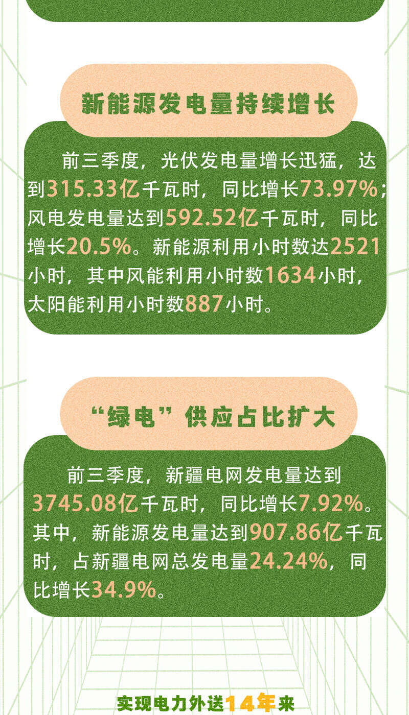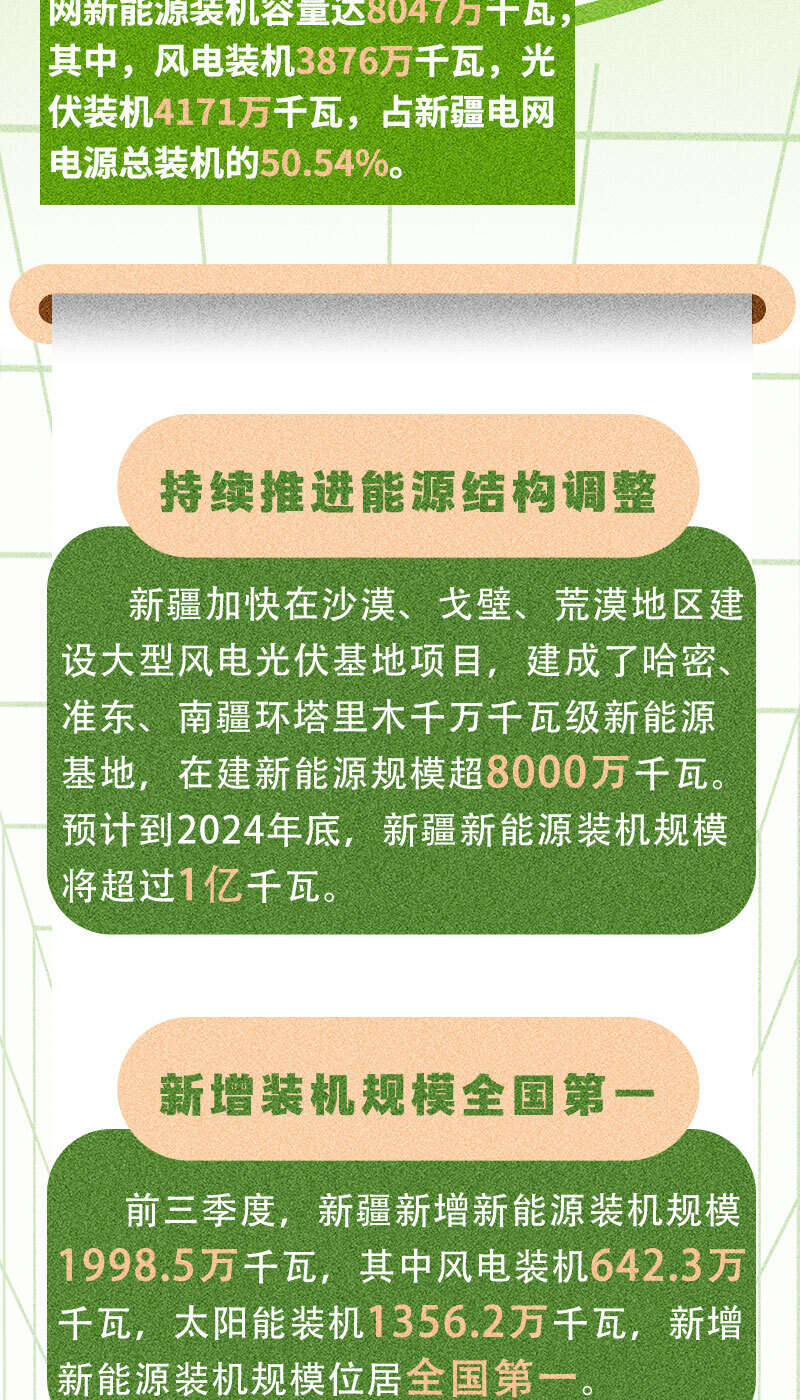 今年前三季度,新疆新增新能源装机规模1998.5万千瓦,新增新能源装机规模位居全国第一。预计到2024年底,新疆新能源装机规模将超过1亿千瓦。新疆新能源产业“风光”无限,动能澎湃,一起来了解。