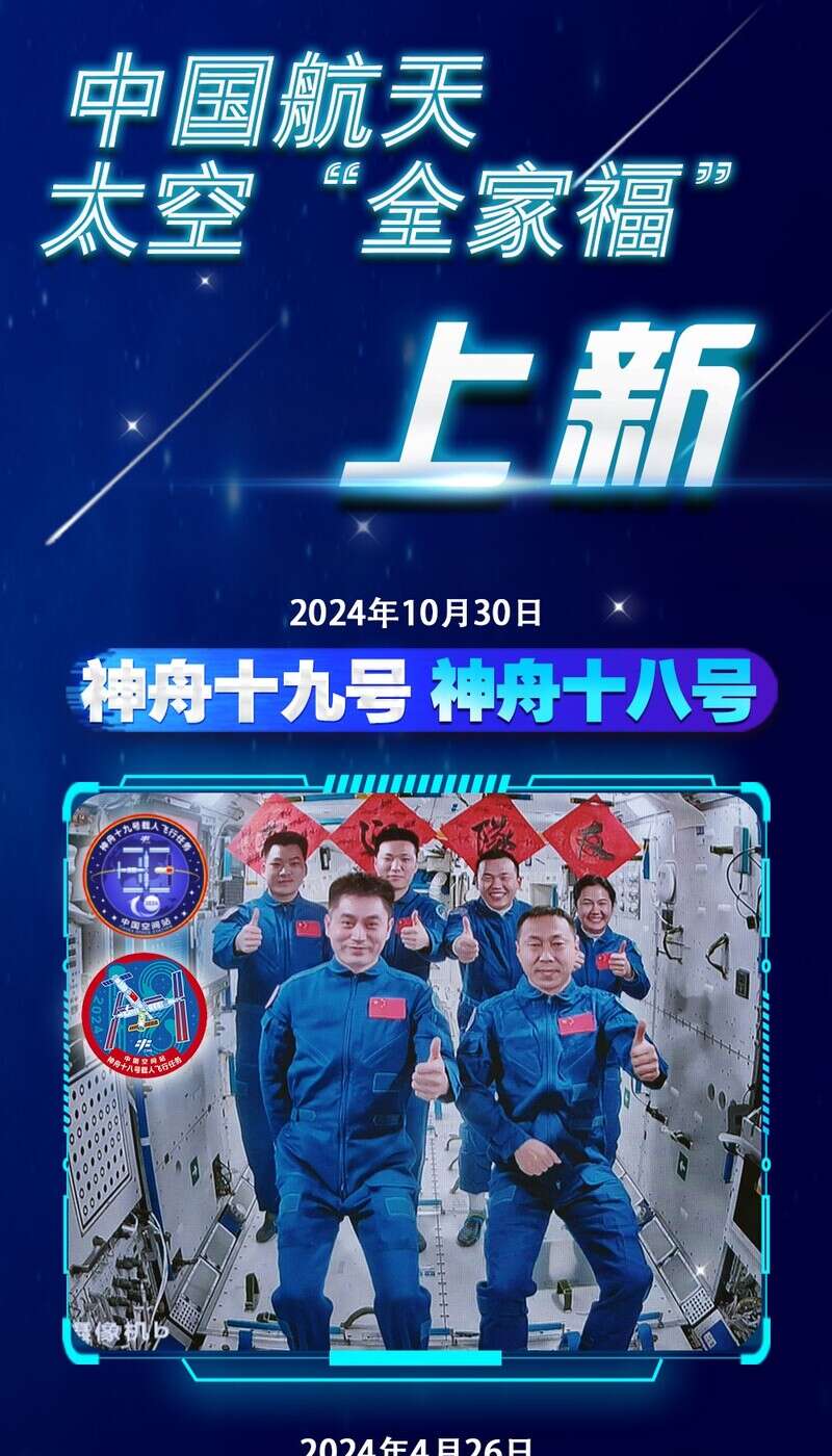据中国载人航天工程办公室消息,北京时间2024年10月30日12时51分,在轨执行任务的神舟十八号航天员乘组顺利打开“家门”,欢迎远道而来的神舟十九号航天员乘组入驻中国空间站,完成中国航天史上第5次“太空会师”。