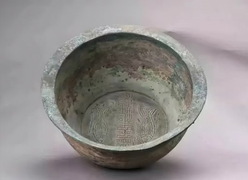 铜洗底部,双鱼之间铸有铭文“建初四年朱提造作”。“建初”是东汉第三个皇帝刘炟的年号,建初四年即公元79年,此铜洗的制作时间距今已近2000年。