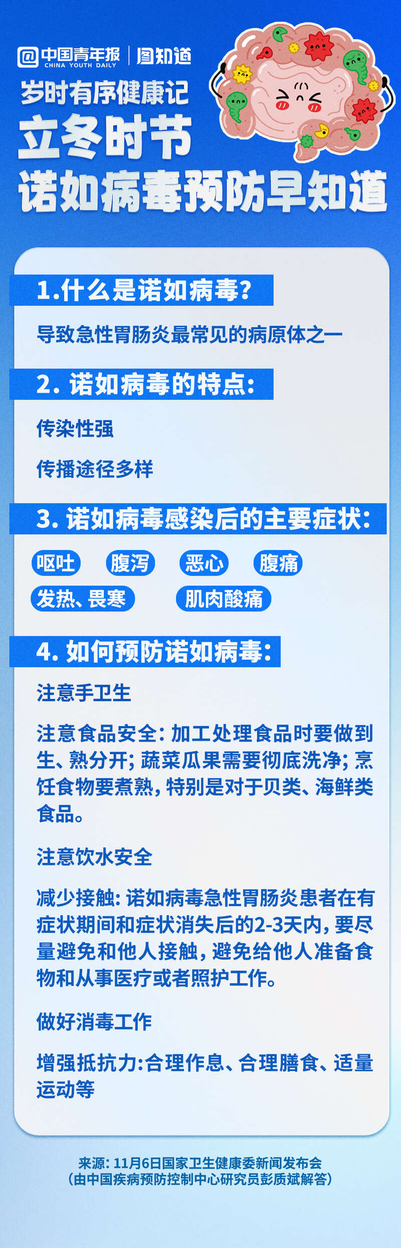 秋冬季节是诺如病毒急性肠胃炎的高发季节。近期,诺如病毒感染在部分地区有增多的趋势。一图了解,什么是诺如病毒?诺如病毒感染后会出现哪些症状?在日常生活中我们应该如何预防?