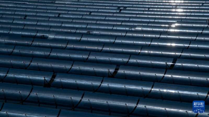 在德令哈市郊,中控50兆瓦塔式光热电站的光热塔在太阳下折射出耀眼光芒,站在塔下,一块块巨大的定日镜将阳光精准反射到塔顶,犹如身处科幻世界。