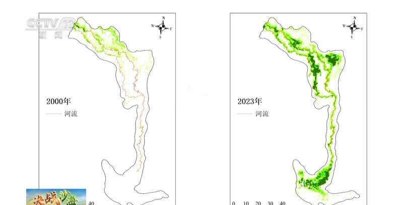 2000年和2023年的这两张卫星遥感图显示,经过连续多年的努力,塔里木河下游绿色明显增加,生态重焕生机。