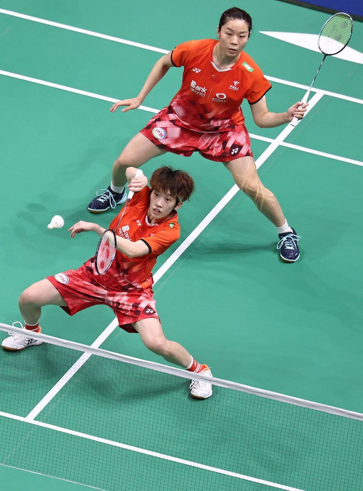 中国女双组合刘圣书(右)和谭宁在比赛中。刘占崑/摄