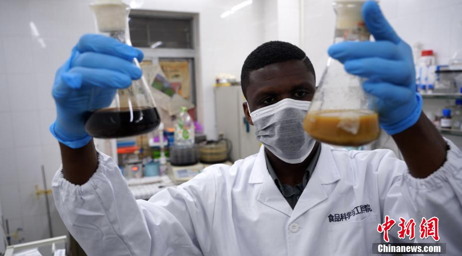 威廉(William)来自非洲加纳首都阿克拉,本科毕业于加纳的发展研究大学营养学专业,在做了两年营养健康医师后,他对儿童营养不良问题感到担忧,于是萌生了提升学历并对营养学做进一步研究的想法。图为广东广州,威廉在华南理工大学实验室里做实验。中新社记者 何俊杰 摄