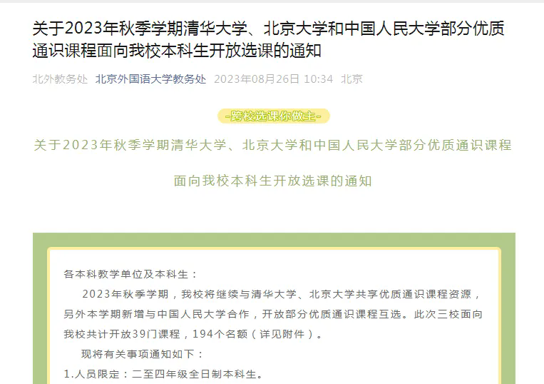 2023年,北京外国语大学又与中国人民大学合作,开放部分优质通识课程互选。