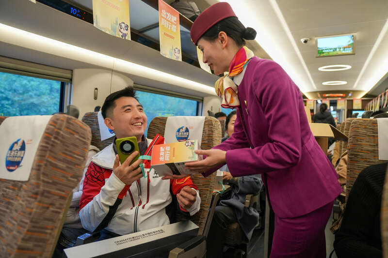 12月3日,成都开往重庆的G8613次列车上,乘务员向旅客赠送纪念品。费思童/摄