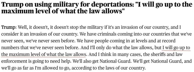 特朗普日前在接受美国媒体采访时重申,他计划在法律允许的范围内最大限度动用军队,推动大规模驱逐非法移民的计划。