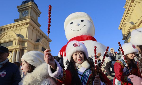2024年12月17日,黑龙江省哈尔滨市,位于音乐长廊的网红大雪人落成,“华夏东极”抚远市在大雪人前免费赠送使用其特产蔓越莓制作的冰糖葫芦。1600串蔓越莓插在4米高的冰糖葫芦树上,游客们排队领取免费品尝,场面十分热烈。南方游客包括黑龙江人,基本都是第一次吃到蔓越莓制作的冰糖葫芦,其酸酸甜甜的味道很受大家欢迎,举着糖葫芦在大雪人下打卡拍照,已成为游人们必选的姿势。