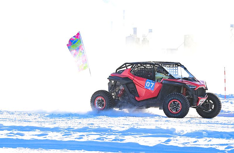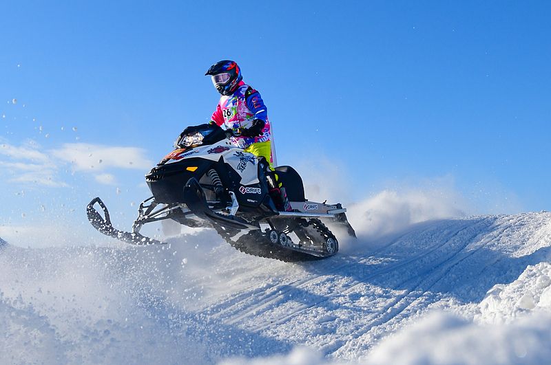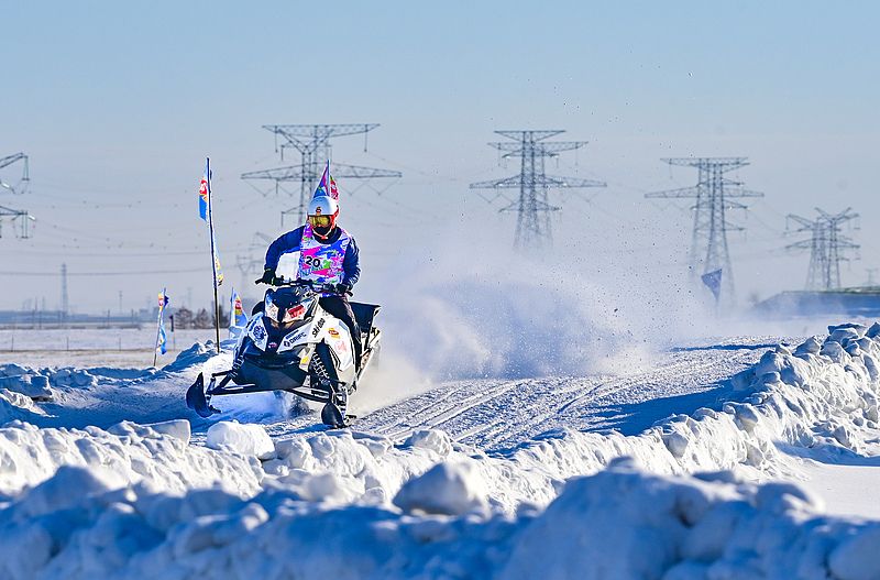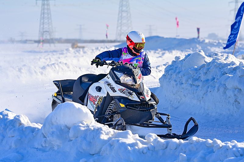 2024年12月25日,内蒙古呼伦贝尔,参赛选手在雪地摩托越野场地大奖赛比赛中。
