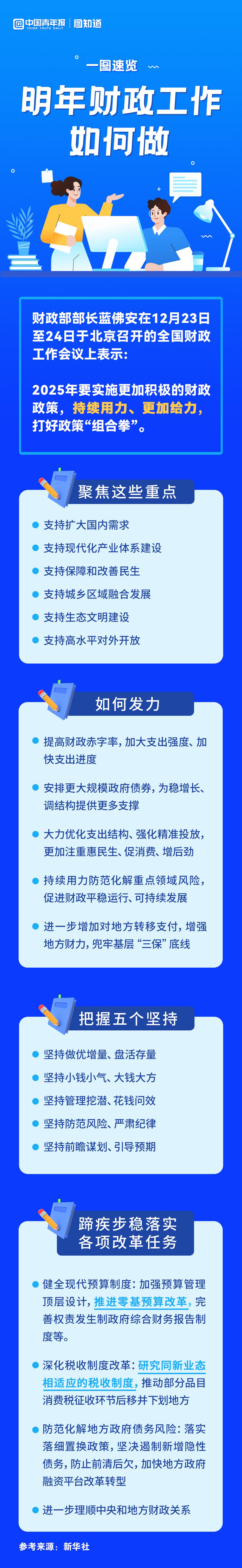 财政部部长蓝佛安近日在全国财政工作会议上表示,2025年要实施更加积极的财政政策,持续用力、更加给力,打好政策“组合拳”。2025年财政工作有哪些重点?如何发力?一图了解。