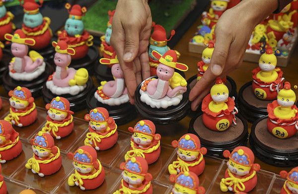 2024年12月27日,山东省临沂市技师学院,该学院教师、省级非物质文化遗产沂蒙面塑传承人韩红元正在摆放刚刚完成的“蛇元素”非遗面塑文创作品。