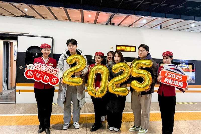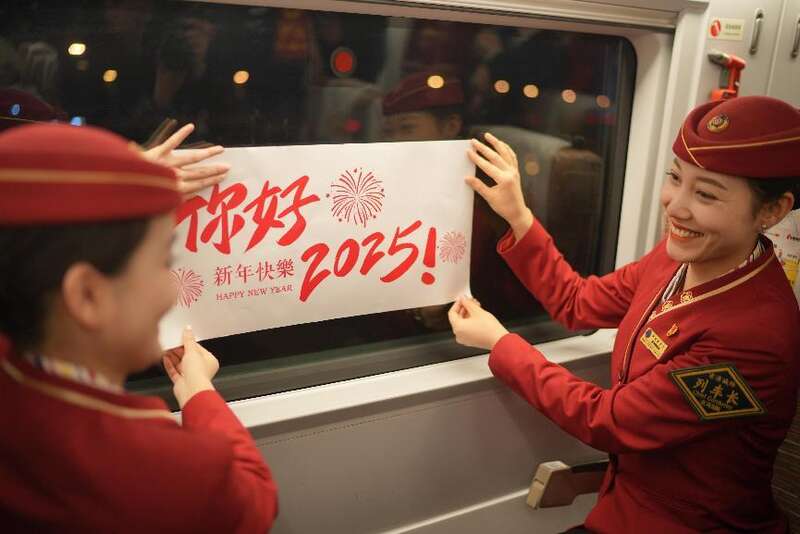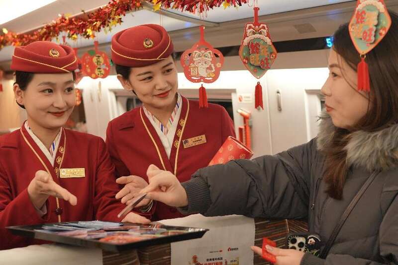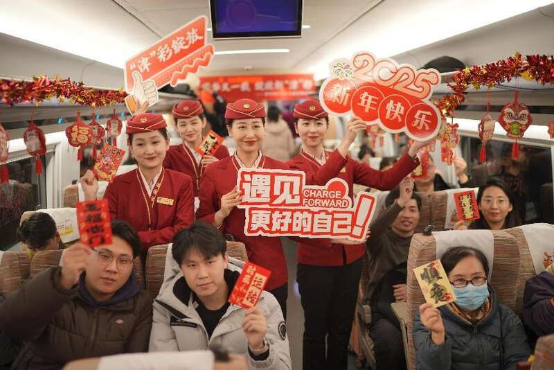 因车次与即将到来的新年数字“2025”恰好吻合,这趟列车被旅客们亲切地称为“2025新年城际列车”,车厢内喜庆的布置,让乘客们一上车就立刻被浓厚的新年氛围所感染。旅途中,乘务组与旅客互动,开展有奖问答,并赠送新年贺卡和蛇年吉祥冰箱贴等小礼物,车厢内时不时传来乘客们的阵阵掌声和笑声。