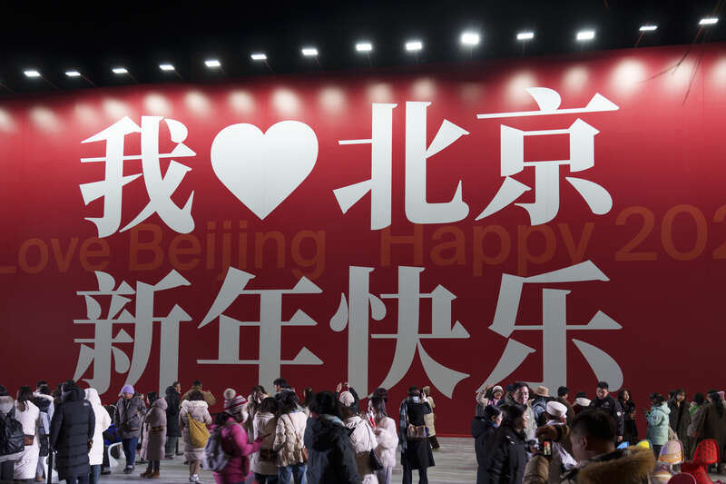2024年12月31日,游客们在798电子广场巨幅标语“我爱北京,新年快乐”面前合影留念。 中青报·中青网见习记者 王梓元/摄