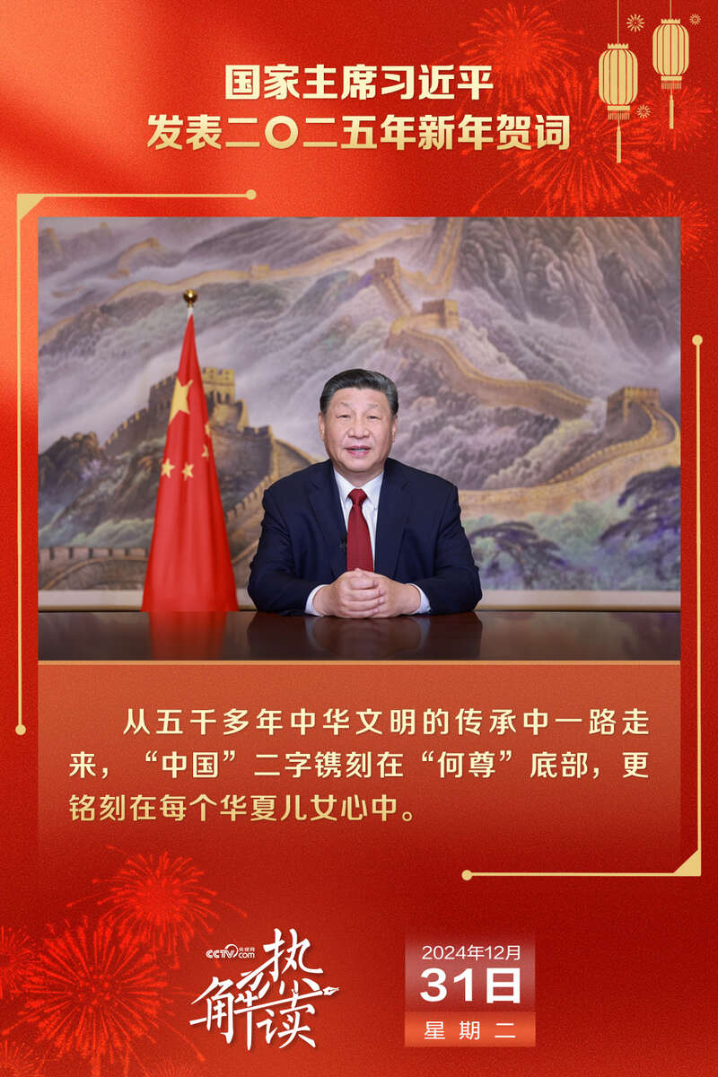 2024年12月31日晚,国家主席习近平通过中央广播电视总台和互联网,发表二〇二五年新年贺词。