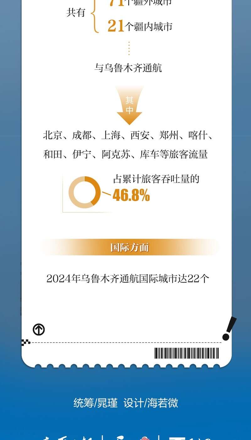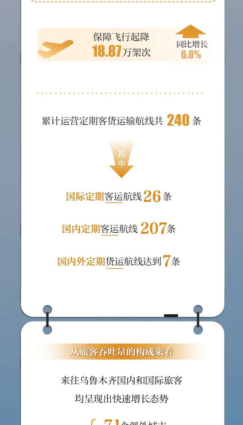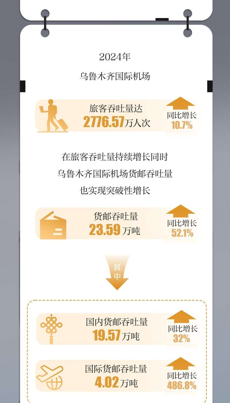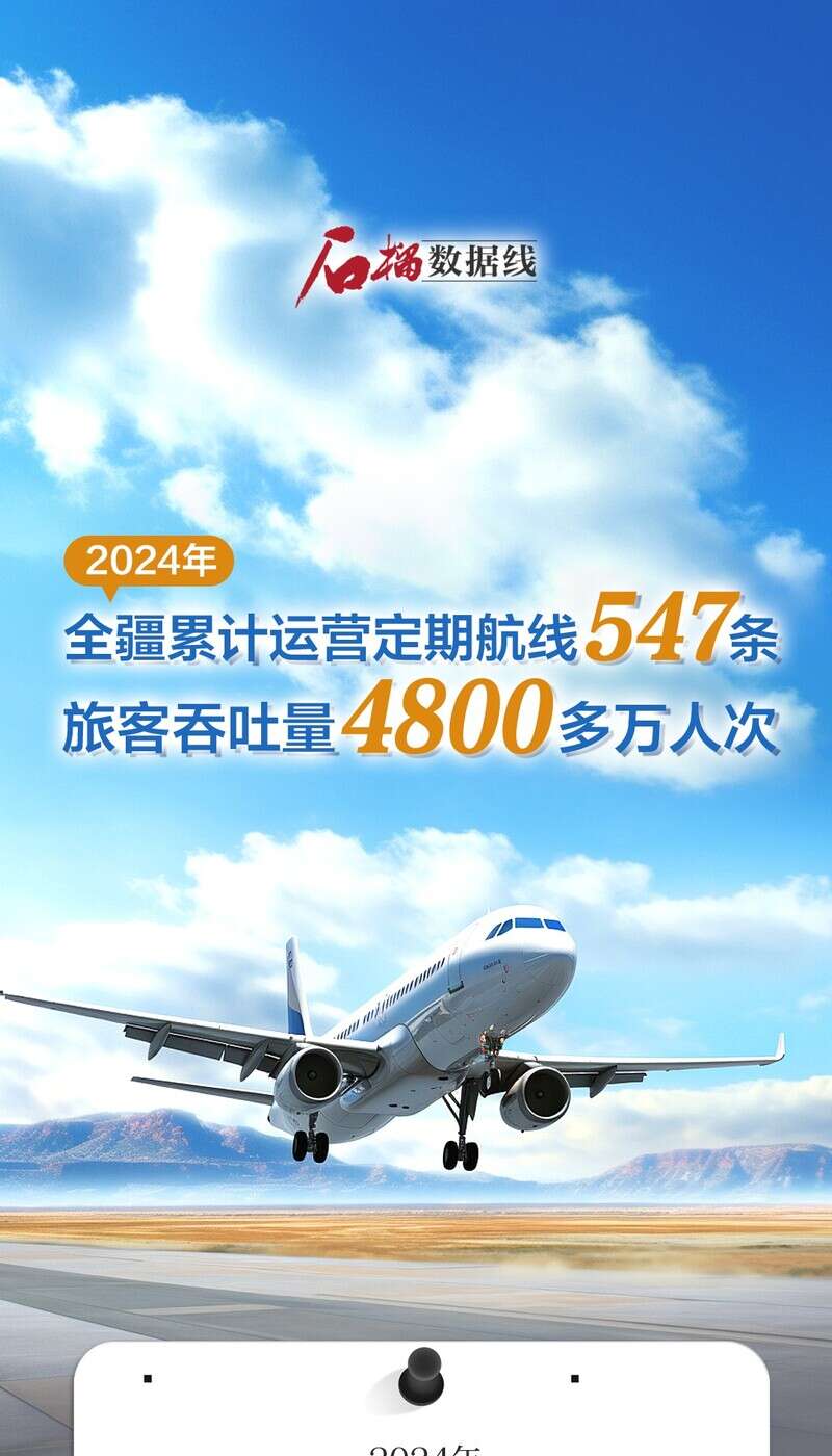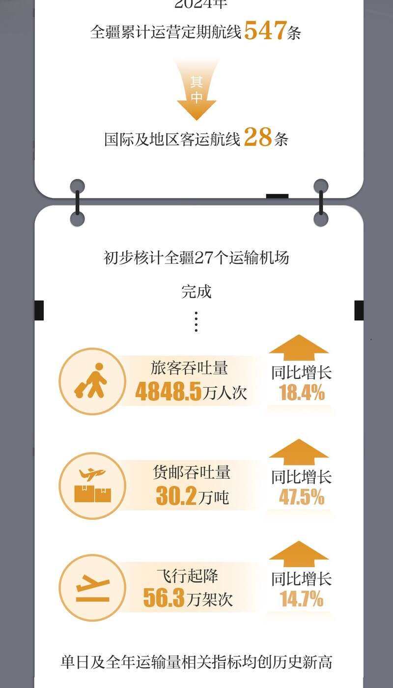2024年,全疆累计运营定期航线547条,其中国际及地区客运航线28条。初步核计全疆27个运输机场完成旅客吞吐量4848.5万人次、货邮吞吐量30.2万吨、飞行起降56.3万架次,同比分别增长18.4%、47.5%、14.7%,单日及全年运输量相关指标均创历史新高。