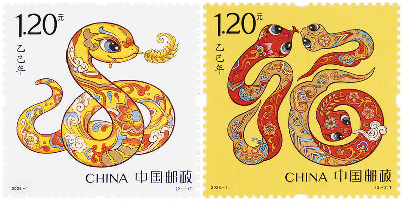 《乙巳年》特种邮票“蛇呈丰稔”(左)“福纳百祥”(右)/主办方供图