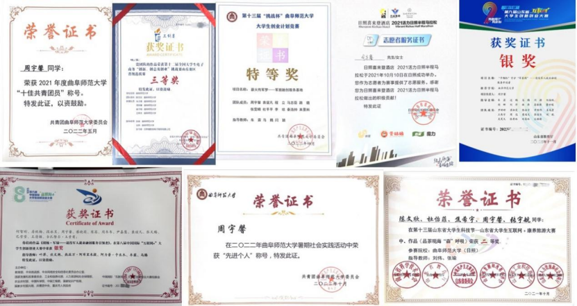 在校期间曾获第八届中国国际“互联网+”大学生创新创业大赛银奖,山东省第九届“互联网+”大学生创新创业大赛银奖,第十三届挑战杯大学生创业计划竞赛山东省铜奖,曲阜师范大学暑期社会实践活动“先进个人”,多次获得三等奖学金、日照市2021年国际半程马拉松赛优秀志愿者等多项奖项,累计参与200余场次的公益服务。