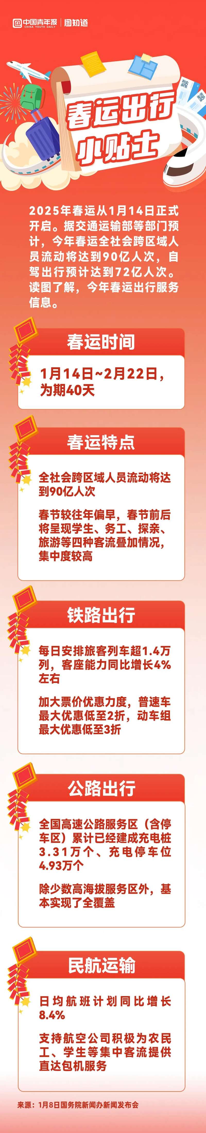 据中国青年报客户端,2025年春运将从1月14日正式开启。据交通运输部等部门预计,今年春运全社会跨区域人员流动将达到90亿人次,自驾出行预计达到72亿人次。读图了解春运出行服务信息。