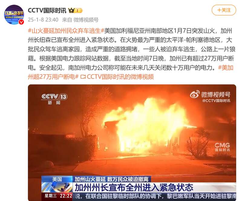 美国加利福尼亚州南部地区1月7日突发山火,加州州长纽森已宣布全州进入紧急状态。在火势最为严重的太平洋-帕利塞德地区,大批民众驾车逃离家园,造成严重的道路拥堵,一些人被迫弃车逃生,公路上一片狼藉。