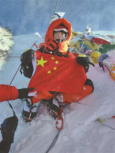 我举着国旗拍了几张照片,作为一位16岁的年轻人,能把国旗带到“地球之巅”,向世界展示我们中国青年充满挑战精神的样子,我感觉很骄傲。
