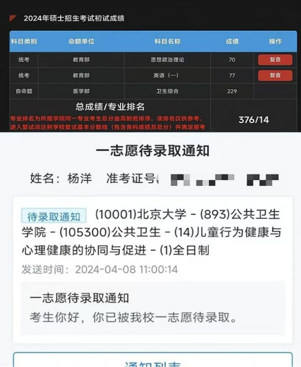 复试结束后,在酒店等待录取通知的24小时是杨洋在整个备考期间最煎熬的时刻,当看到自己的名字出现在拟录取名单上时,杨洋喜极而泣,这一次,坚持与努力再一次帮助她赢得了胜利!